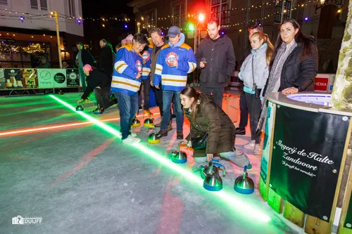 De curlingsport geeft naast de competitiestrijd vooral ook veel plezier en onderlinge saamhorigheid. Als je dat mag beleven op zo'n prachtig verlichte curlingbaan, dan ben je een bofkont. Maar ook de toeschouwers genieten van de deelnemers, die zich op glad ijs begeven.