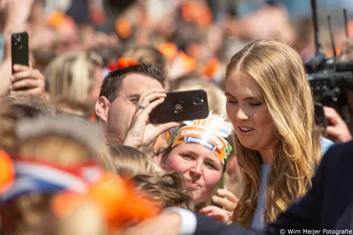 Maxima en Amalia als door de duizenden aanwezige feestvierders.
