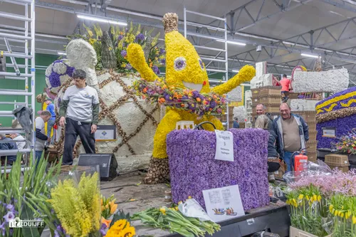 Vele vrijwilligers en bestuursleden zetten zich tijdens de opbouwdagen of 'steekdagen' in om de prachtig ontworpen praalwagens, auto's en overige voertuigen die deelnemen aan de jaarlijkse corso in de bloemetjes te zetten. Over dit schitterende evenement valt zoveel te vertellen, dat ik u zeker aanbeveel de website van de Corso te bezoeken. (Link verderop in dit artikel) Op die website vindt.u alle informatie over de deelnemers, de geschiedenis enuiteraard de route die de Corso zaterdag 12 april aflegt. Hier onder een foto- en filmimpressie van dag twee van de zeer druk bezochte steekdagen. Drukker bezocht dan voorgaande jaren, nu in Noordwijkerhout van een gunstig gelegen opbouwlocatie gebruik kon worden gemaakt.