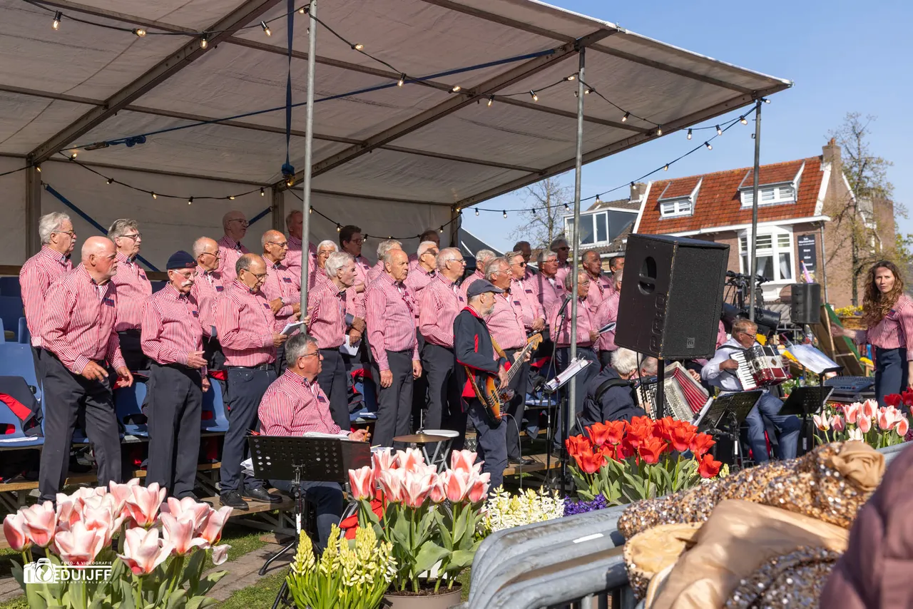 Noordwijkerhout - Vrijdagavond 11 april vierde Noordwijkerhout een feestje rond het witte kerkje in het centrum. Inwoners en veel bezoekers waaronder buitenlandse toeristen genoten van diverse straatartiesten, koorzang en blaasorkesten.