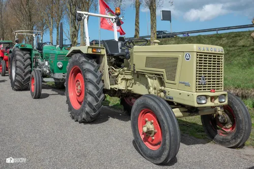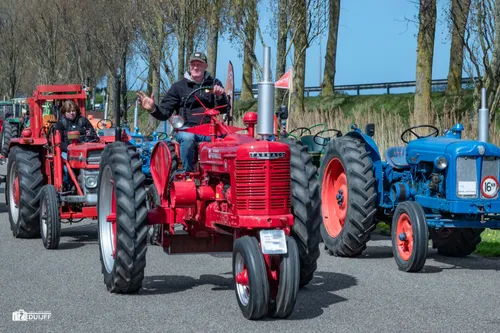 Bij de Polderschuur aan de Spieringweg in Vijfhuizen Haarlemmermeer verzamelden zich in de ochtend van zondag 12 april de berijders van zo'n zestig tot zeventig tractoren, waaronder een groot aantal zorgvuldig gerestaureerde oldtimers. Rond 09.00 uur vertrok de stoet voor een tocht door de bollenstreek.