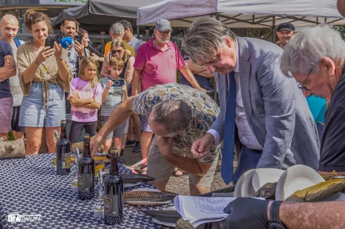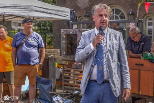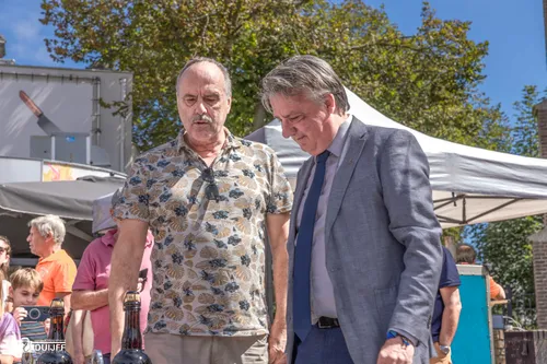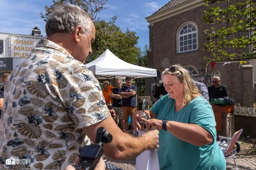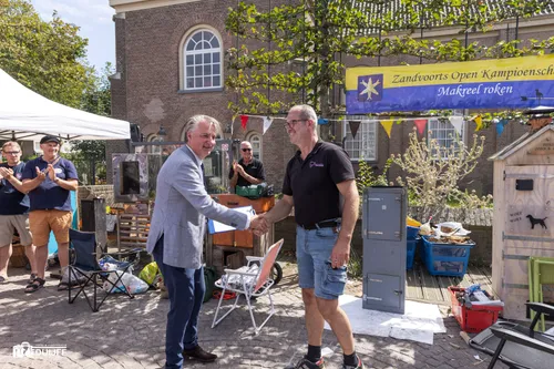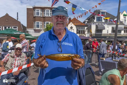 Burgemeester David Moolenburgh bijgestaan door wethouder Gert-Jan Bluijs traden op als keurmeester. Dat deden ze overigens al vaker. Als collegeleden dit keer niet af te doen als hamerstuk. Met de Zandvoortse Grand Prix in het vooruitzicht nu een Grand Prix in de vorm van een beker voor de best gerookte makreel. Goud van kleur, dus een gouden jasje....