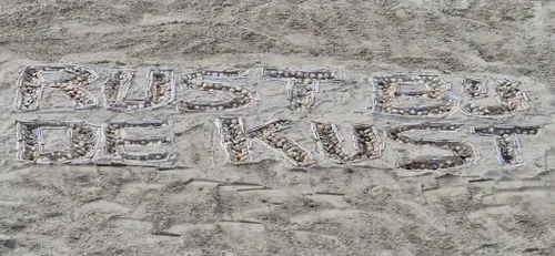 Met schelpen werd de tekst ‘Rust bij de Kust’ in het zand geschreven en er