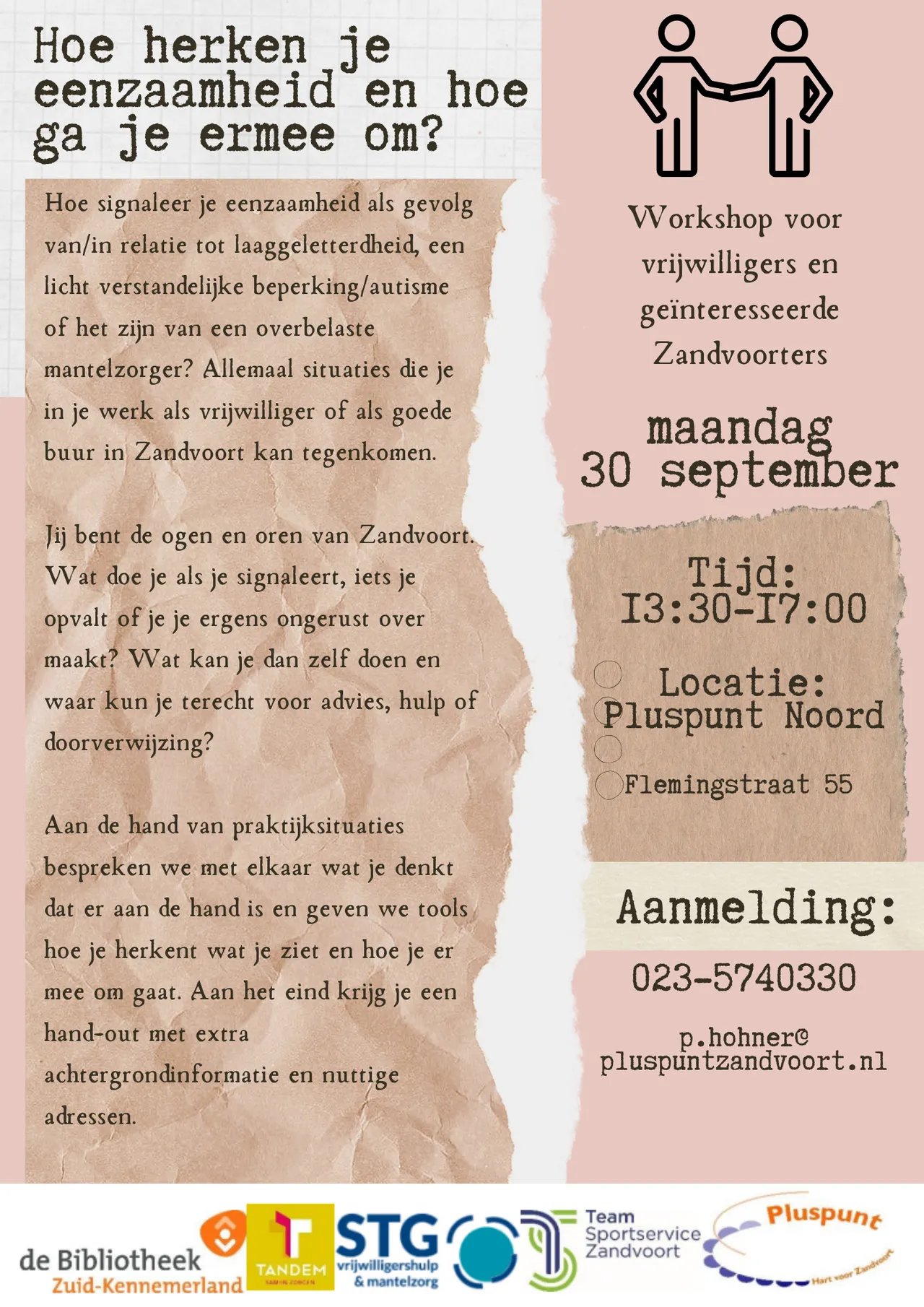 ZANDVOORT – Op maandag 30 september organiseert Pluspunt Zandvoort een speciale workshop voor vrijwilligers en geïnteresseerde Zandvoorters. Het thema? Eenzaamheid.