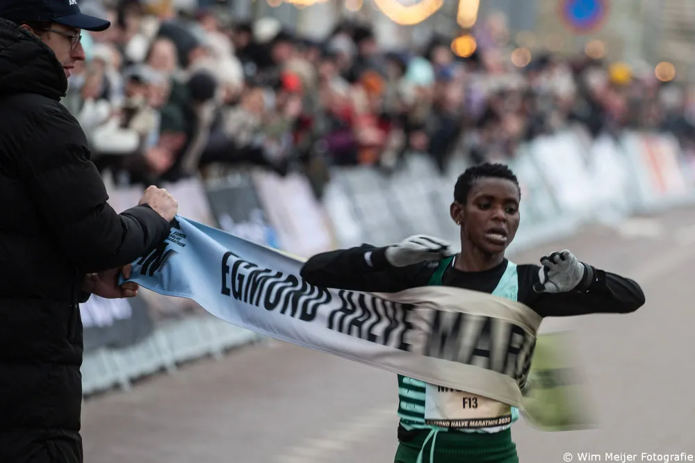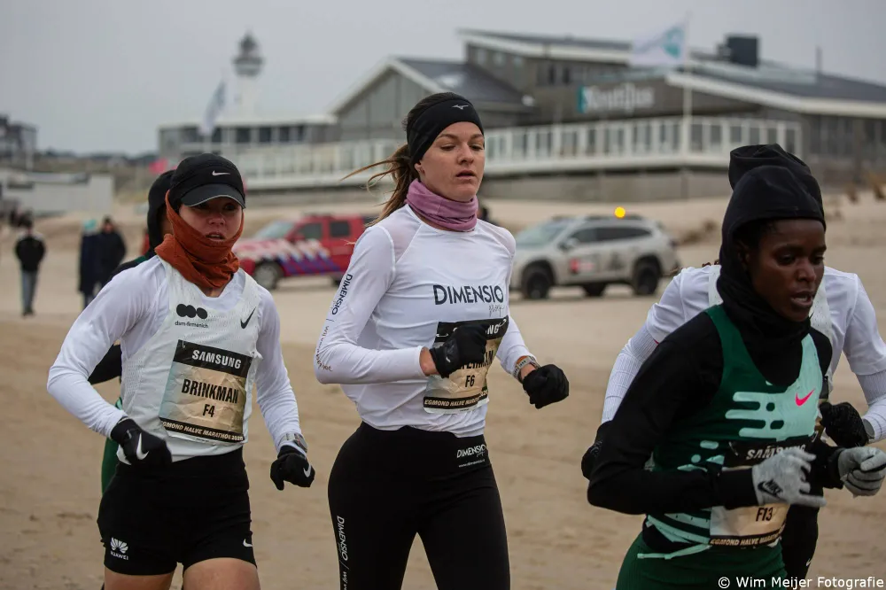 In totaal stonden er vandaag zo’n 13.500 lopers aan de start van de 51e editie van de Egmond Halve Marathon, waarvan verreweg het merendeel recreanten. Vooral voor hen wat het een forse uitdaging, niet alleen door de afstand en het per definitie al zware parcours, maar vooral ook door de winterse omstandigheden. Vooral op het strand hadden de deelnemers te dealen met vrieskou in combinatie met tegenwind wat een gevoelswaarde opleverde van rond de min 10 graden. Mutsen, handschoenen, heel veel laagjes, warmtekussentjes en zelfs verwarmde handschoenen werden ingezet om de koude te trotseren. Eenmaal bij Castricum aangekomen bleken al deze attributen niet meer nodig, want in de beschutting van de duinen en de wind licht in de rug werden prima loopomstandigheden, wat ertoe leidde dat er toch vooral lachende gezichten over de finish kwamen.
