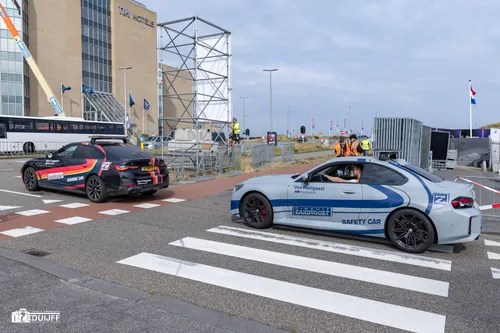 Op de Burgemeester van Alphenstraat staan dagelijks diverse verkeersregelaars, om personenauto's, trucks met (race)auto's, reclame medewerkers, leveranciers evenementensupply en horecagoederen, you name it, veilig naar binnen te loodsen of te laten vertrekken. Bij de ingang beveiligingsmedewerkers, die toezien of je recht heb het circuitterrein te betreden. Bij de ingang ook veel belangstellenden, die trucks met raceauto's en later in de week ook coureurs hopen te zien arriveren. Dat blijkt aardig onvoorspelbaar. Een toevalstreffer, of geluk zo u wilt. Gewapend met camera of filmapparatuur, uren wachten... Bekijk hieronder het filmpje van John van der Wal.